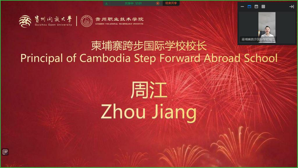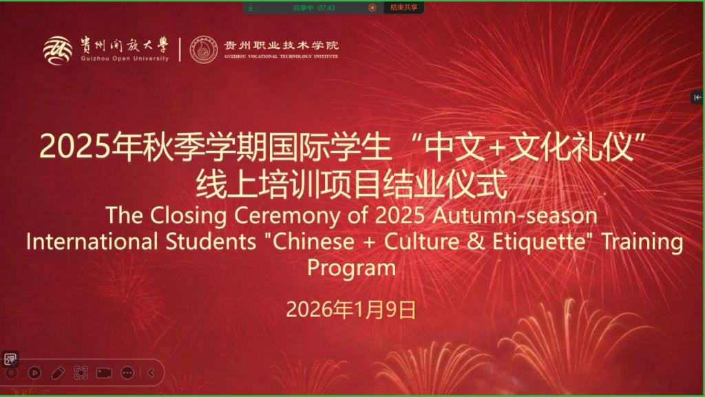2026年1月9日晚贵州开放大学(贵州职业技术学院)举办的2025年秋季学期“中文+职业技能”线上培训项目圆满结束,并在线举行结业仪式。柬埔寨跨步国际学校、贵州前进轮胎越南有限公司代表及两国学员在线发言,高度评价了培训成果。